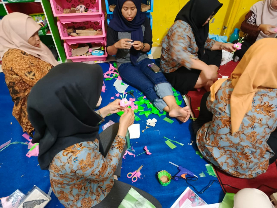 Pelatihan Pembuatan Kerajinan Tangan dari Barang Bekas ini memanfaatkan pelastik bekas yang dibuat menjadi bunga, serta gelas plastik bekas air mineral yang dihias menjadi vas bunga. Untuk membuat kelopak bunga, diperlukan dua buah plastik kresek warna-warni yang digunting kotak, ditumpuk atau dilipat menjadi dua lapisan, kemudian disetrika hingga menjadi kaku dan menempel satu sama lain. Hasil plastik yang telah disetrika lalu digunting membentuk beberapa pola kelopak bunga. Untuk daunnya, dibuat menggunakan plastik kresek berwarna hijau, kemudian disetrika dan digunting sesuai pola daun seperti proses membuat kelopal bunga. Pola daun dan kelopak bunga tadi disusun menggunakan lem lilin dan ditempel pada kawat bunga sesuai bentuk yang diinginkan.